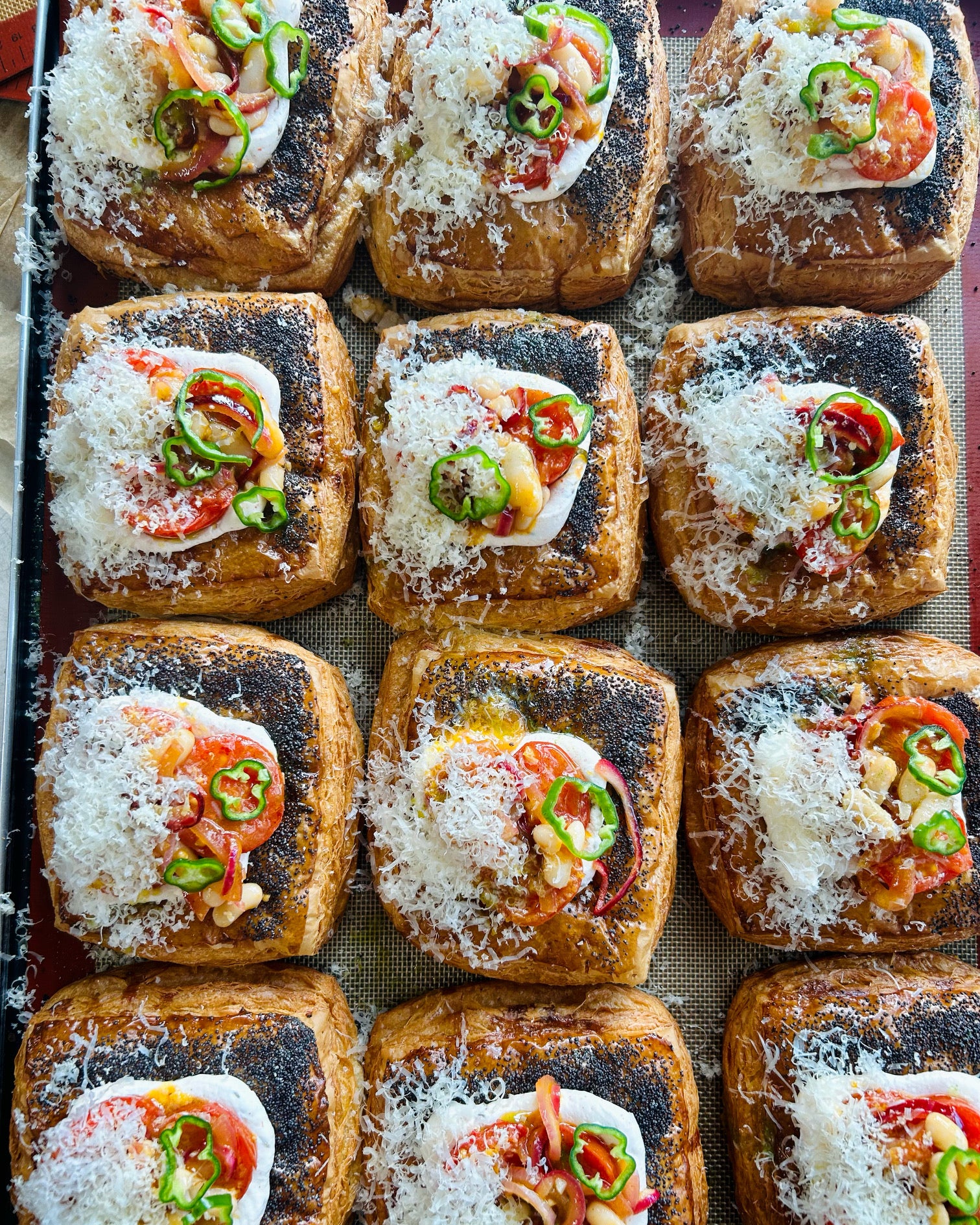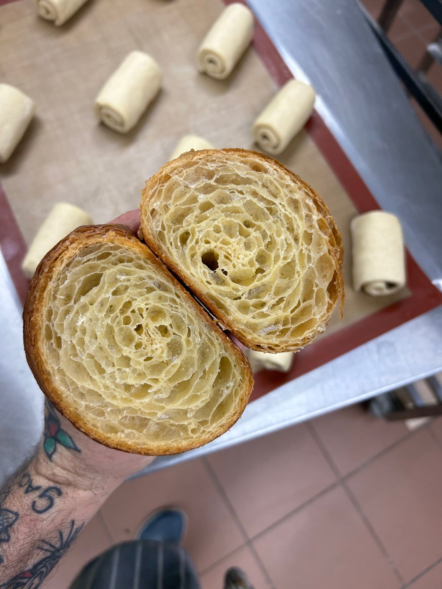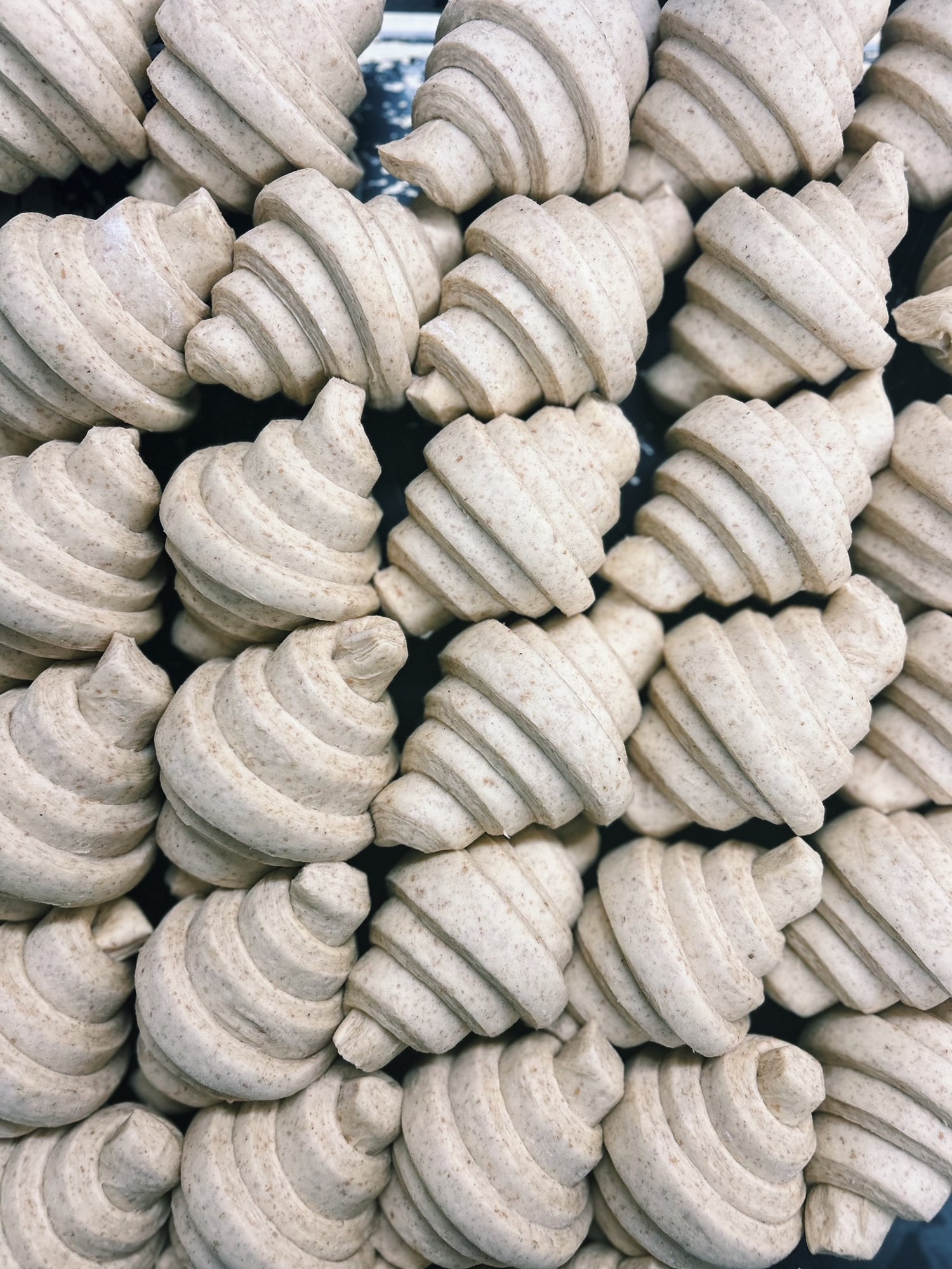 All our Viennoiserie is slow fermented, made over three days, to increase the flavour, texture and digestabilty. We steer away from the white flour filled croissant, and instead substitue stoneground UK or Irish wholegrain flour.
